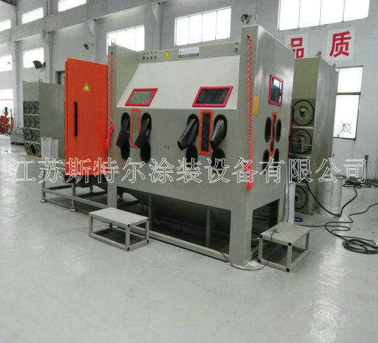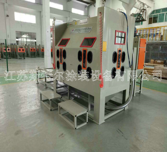 多工位手動噴砂機是我公司為上海麥鑫船舶科技四虎影视免费永久大全-四虎8848精品成人免费网站-四虎视频国产精品免费入口-四虎4hu永久免费网站影院量身定制的一款噴砂機,用于船舶渦輪增壓器、調速器的維修保養等,以提高產品表面處理的效率及質量而定制的噴砂機。該設備設計有3個操作工位,承重1噸的工作臺車架,方便對工件360度進行噴砂,該噴砂機可以實現多方位噴砂處理有效解決在噴砂加工期間的大工件無法翻面等問題,噴砂機工作室采用噴砂耐磨橡膠板雙層防護等特點提高工作倉的使用年限,照明裝置采用目前最好的LED噴砂機專用照明燈亮度及使用壽命都非常好。 除塵系統是由2濾筒和一臺2.2KW的風機組成,濾筒清洗由脈沖巡回系統反吹進行清洗。可一次性吹掃殘留在濾筒表面的微小顆粒。此脈沖控制儀采用微電腦自動化控制,只需簡單調試便可使用。噴砂室空間為4400mm*2000mm,配有4盞防爆節能燈,簡單方便的設計非常符合客戶的要求。