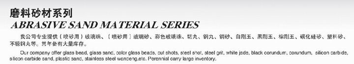 (噴砂用(yong))有機破(po)璃珠(zhu)、(噴砂用(yong))有機破(po)璃砂、顏色(se)有機破(po)璃珠(zhu)、切丸、鋼(gang)丸、鋼(gang)砂、白剛玉、黑剛玉、棕(zong)剛玉、增(zeng)碳硅砂、金(jin)屬(shu)砂、不銹鋼(gang)裝飾管(guan)丸等。美容店配(pei)備很多存貨。